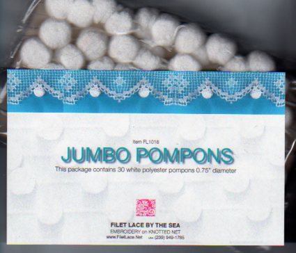 POMPONS - 30 JUMBO WHITE BALLS Jumbo Pompons in Polyester, mounted on a white cord. 0.75" diameter braided cord is 2 mm thick The 2 mm cord can be easily replaced by a finer thread using the little metal eylet. Pompom can be covered using a crochet or a needle. Each package contains 30 pompons on a cord. Click Add to Cart to order this product.
